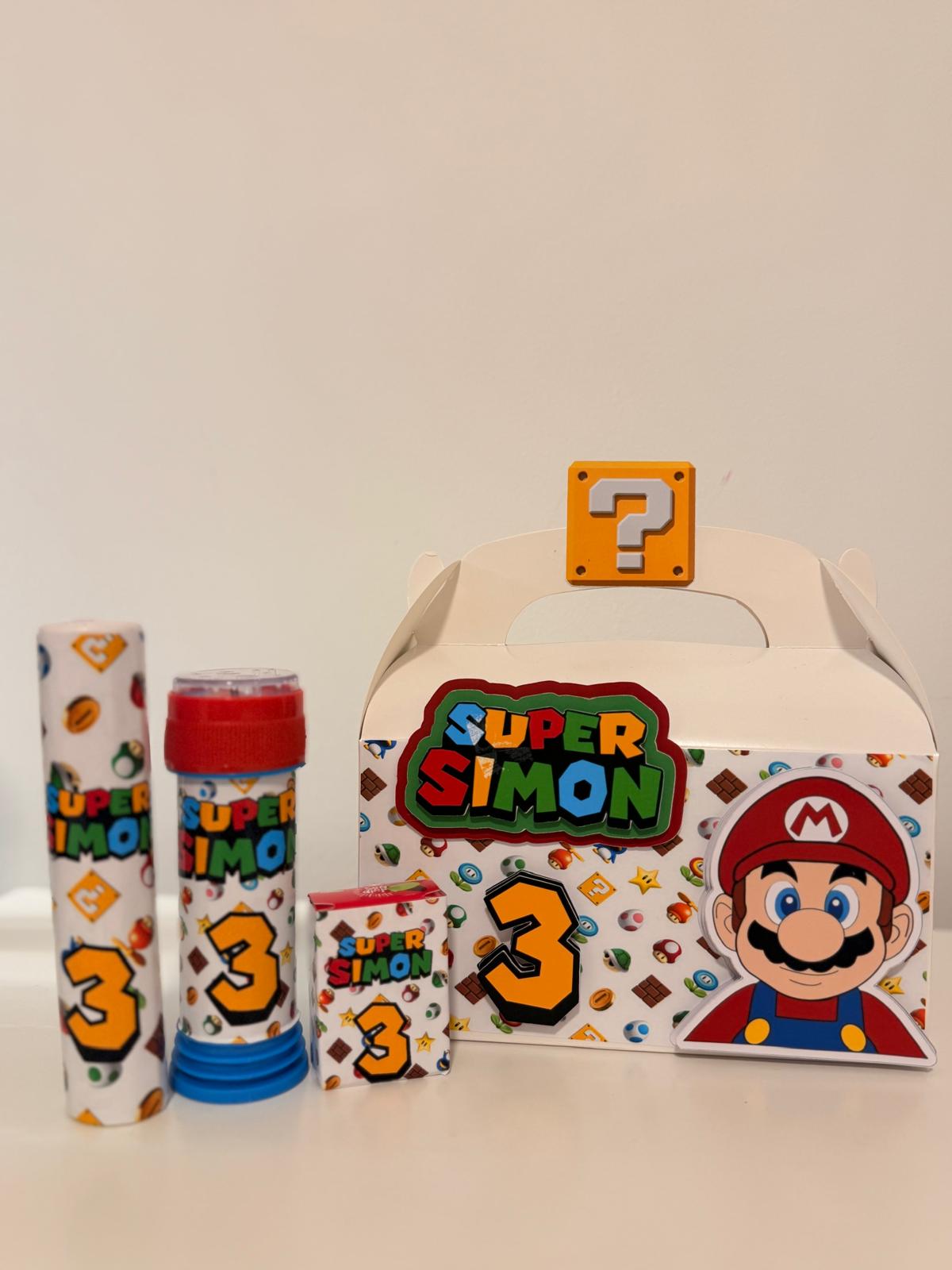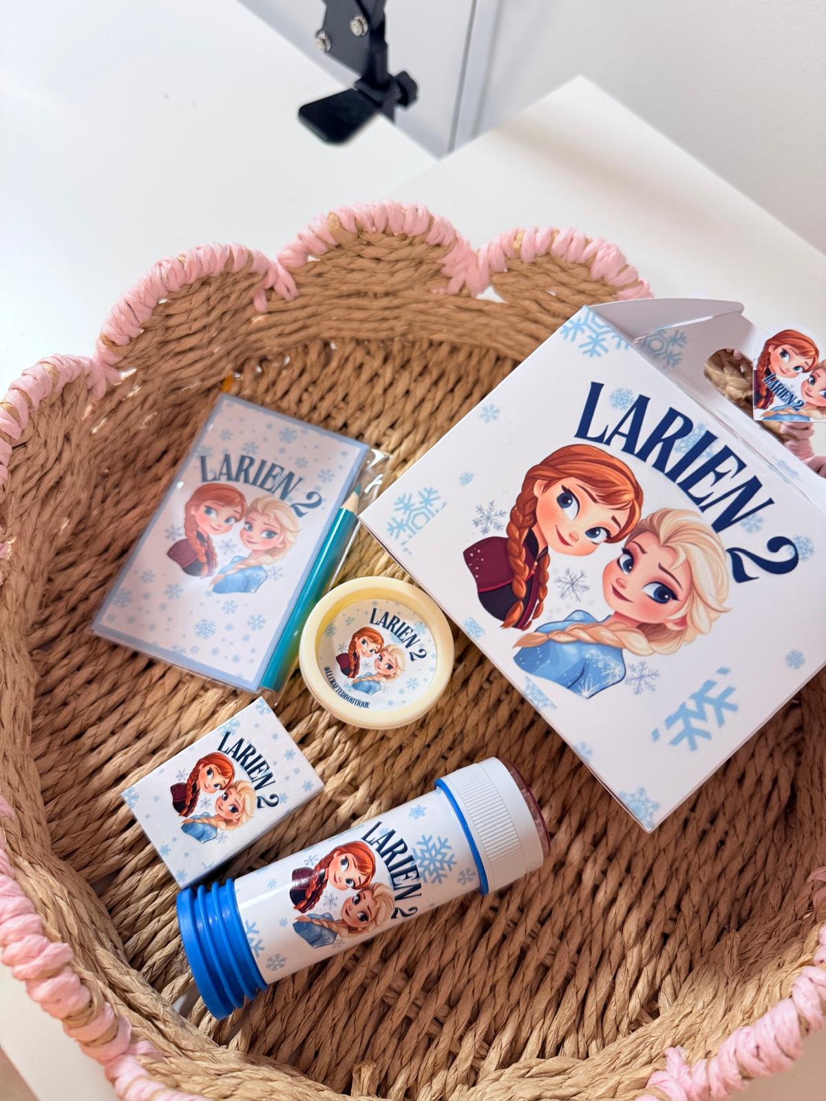Personalised classic gable box set, filled with customised goodies including a bubble blower, coloring book, dried grapes, slime or dough, each item personalised with name and theme.